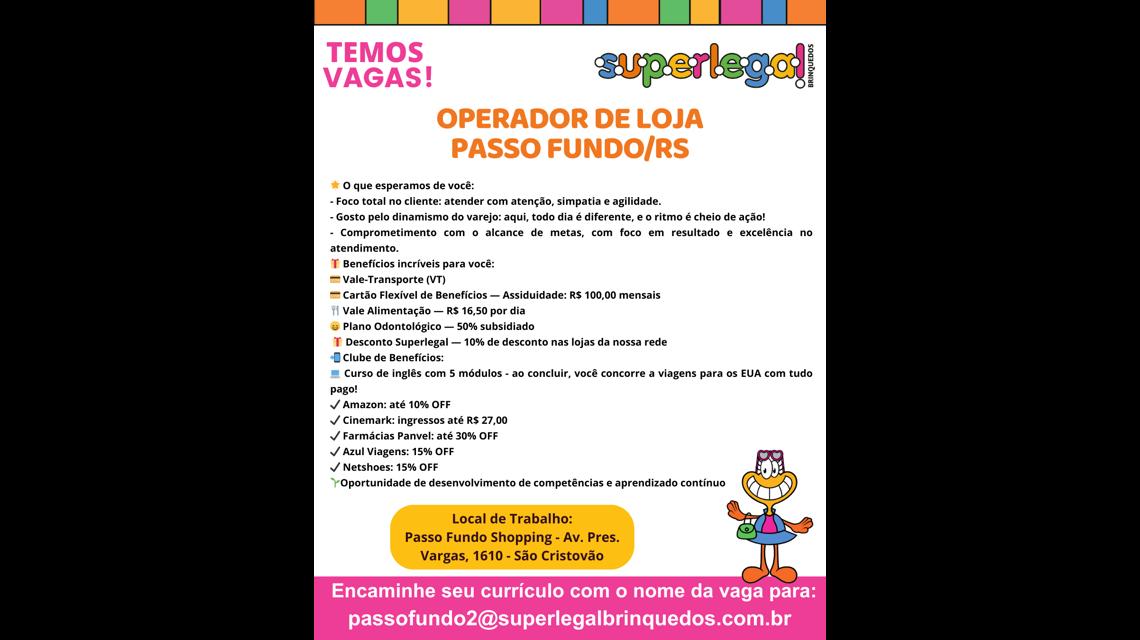 Local de trabalho: Passo Fundo Shopping - Avenida Presidente Vargas, 1610 - loja 1014 Shopping - São Cristovao, Passo Fundo